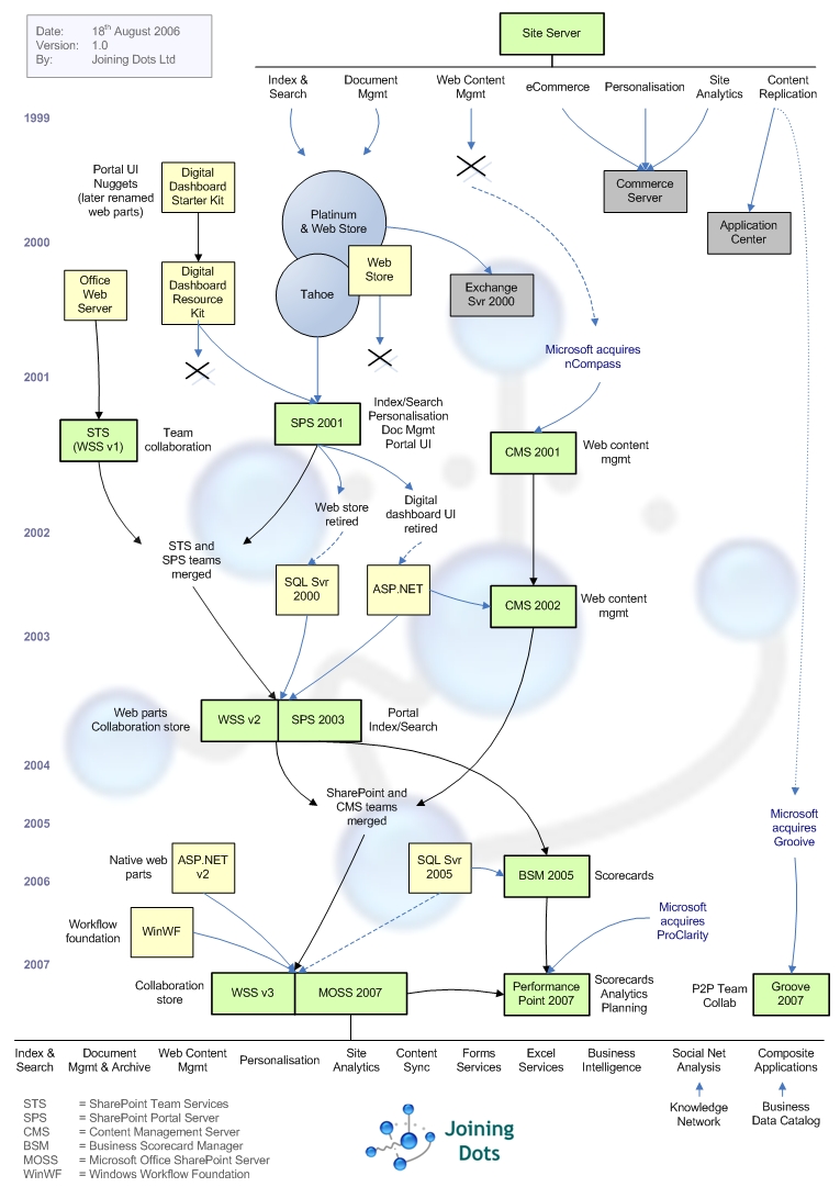 Cũng năm 2001, Microsoft đã mua lại sản phẩm quản lý nội dung của nCompass, và phát triển thành dòng sản phẩm Content Management Server 2001 (CMS 2001). Sau này, sản phẩm CMS được phát triển và tích hợp vào MOSS 2007 và Windows Sharepoint Services v3.0. Ngoài ra, Microsoft cũng phát hành phiên bản Sharepoint Team Service (STS) đính kèm trong bộ Office 2000. Đây chính là phiên bản đính kèm miễn phí cung cấp tính năng Team Collaboration dựa trên nền tảng web.